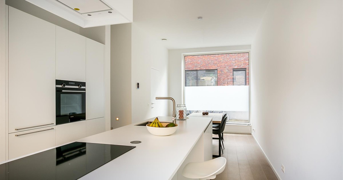 De gelijkvloerse verdieping maakt plaats voor een privatieve inkomhal met gastentoilet. De leefruimte geniet van ongeloofelijk veel licht, dit dankzij een enorme plafondhoogte en grote ramen aan weerszijde. Vanuit de leefruimte heeft men toegang tot een mooie binnentuin. Verder vinden we hier de open keuken met aansluitend een praktische berging.