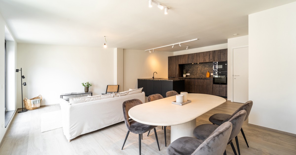 De eerste verdieping maakt plaats voor de leefruimte en keuken welke uitgerust is met hoogwaardige toestellen en is helemaal in de laatste nieuwe trends afgewerkt. Vanuit de eet- en leefruimte heeft men toegang tot een leuk privé terras van ca. 29m2.