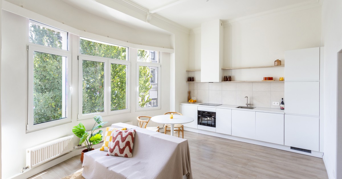 De leefruimte met hoge plafonds en drie grote ramen baadt in het licht en biedt een vrij uitzicht zonder inkijk. De open keuken is volledig uitgerust met kwalitatieve toestellen (combi-oven, vaatwasser, koelkast met vriesvak, dampkap, was- en droogmachine) en stijlvol geïntegreerd in het interieur.