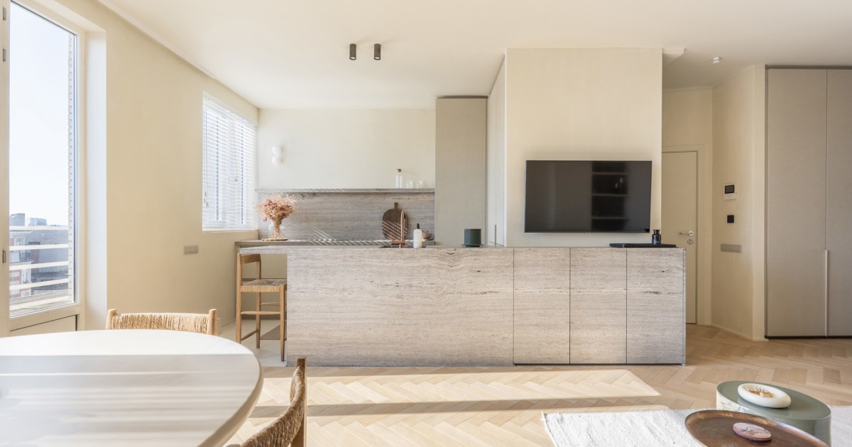 De op maat gemaakte keuken vormt het kloppend hart van het appartement en werd afgewerkt met hoogwaardige materialen zoals een travertin werkblad en een Novy Panorama kookplaat. Aansluitend bevindt zich de lichtrijke leefruimte op visgraatparket, die naadloos overgaat in het zuidgerichte terras met open en weids uitzicht.